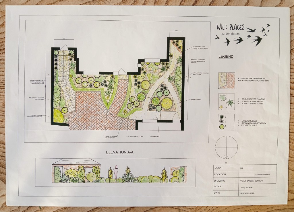 The Clients reviewed the concept, and we agreed a couple of tweaks – evergreen standard Ilex Sp. replaced obelisks and from there we proceeded with the detailed plans.