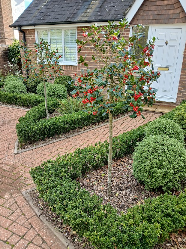 The paving was in good condition, and certain shrubs were healthy and could be retained. A chic, evergreen scheme that was very easy to maintain was preferred, with year-round seasonal interest. Flowers were not especially valued, so we settled on interest from berries, stems and textures.