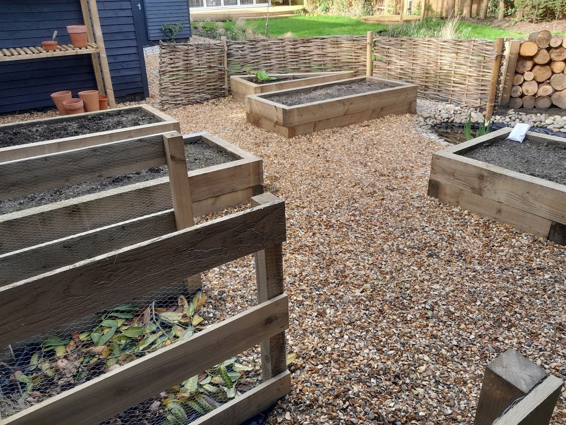 UC4 sleepers provide generous beds, hazel hurdles keep children and dogs out of this area. A bespoke potting bench and two self-fertile apples fan trained