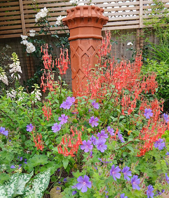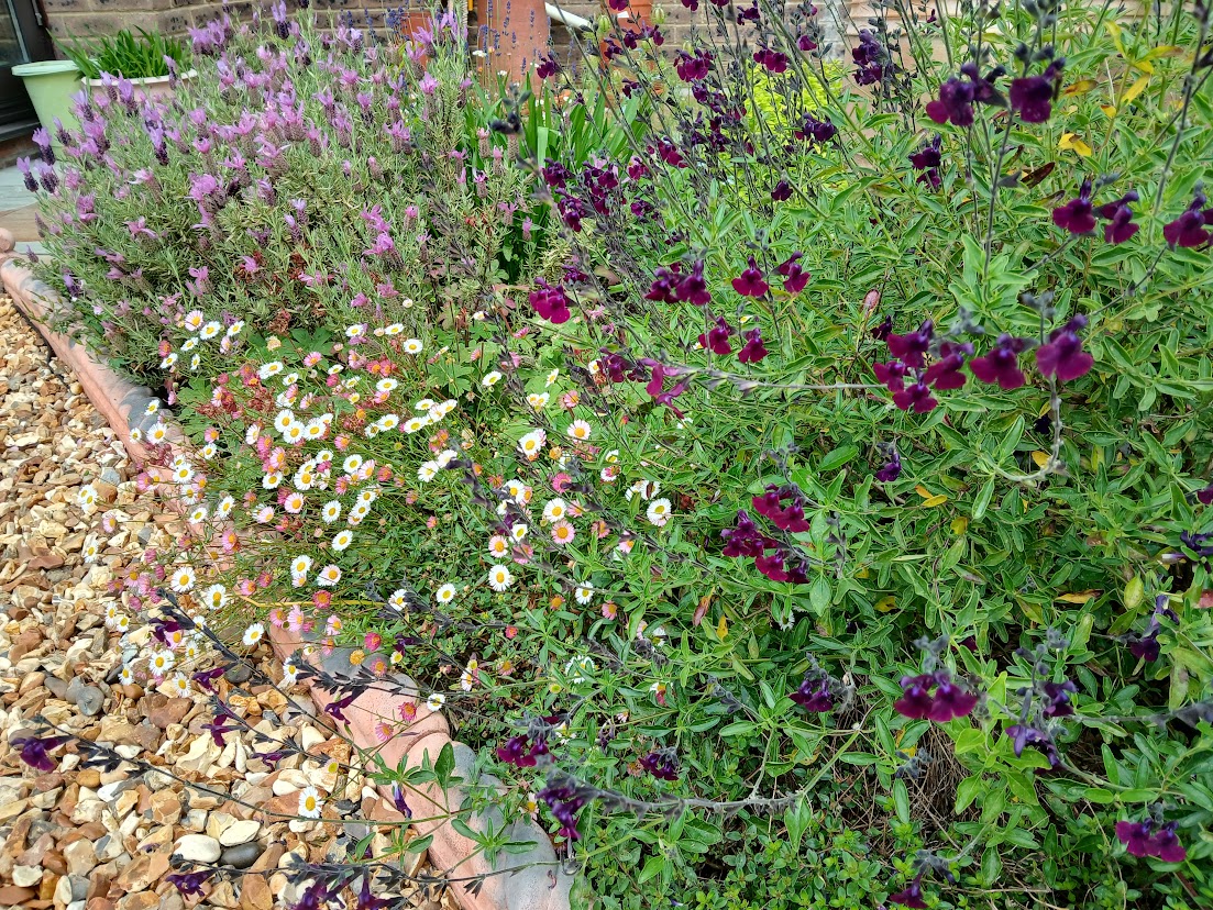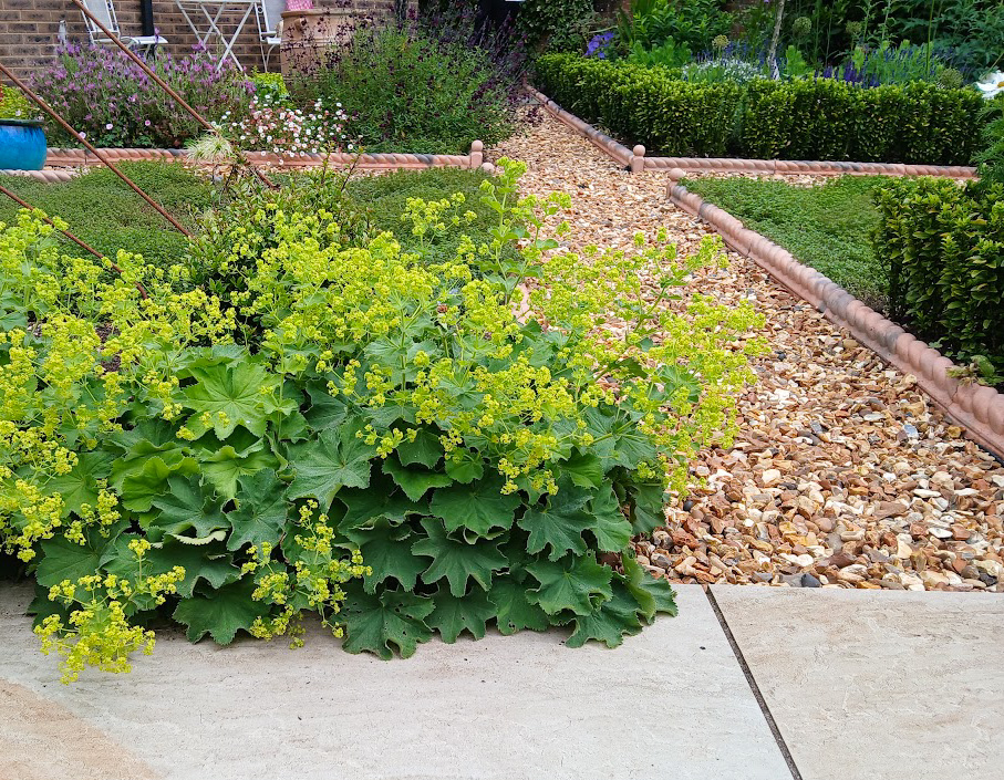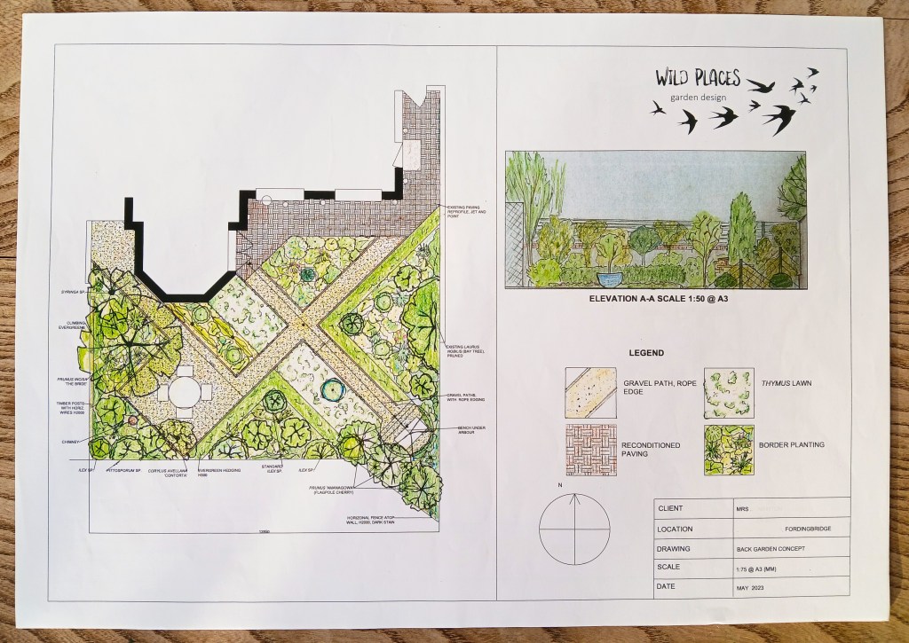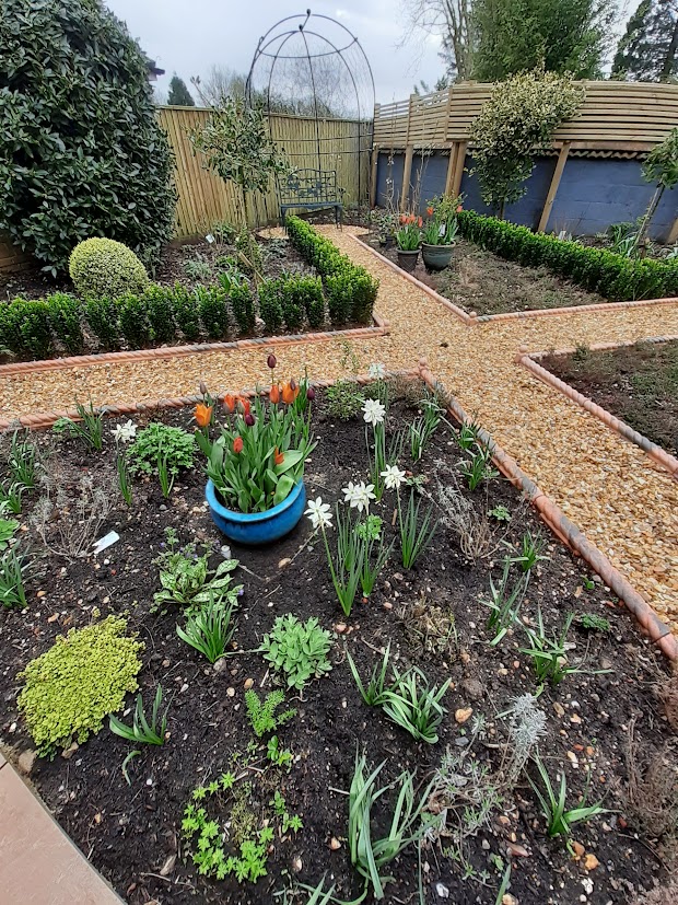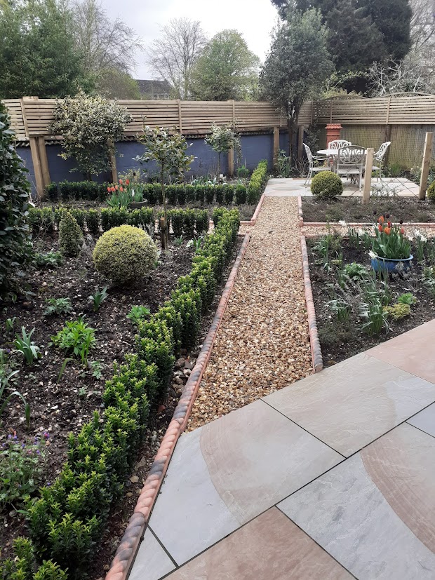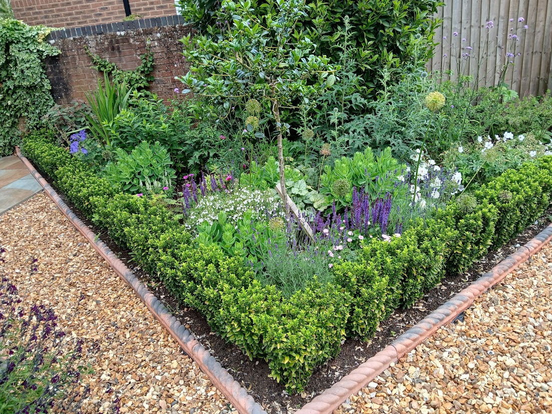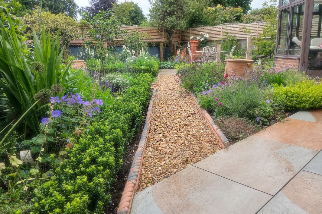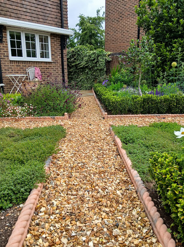 Relacing the block paved patio with a narrower Yorkstone effect paver allowed us to bring the planting closer to the house, and the use of low hedging gives a semi-formal feeling, helping the space feel neat even if the border planting is more relaxed. Rope edging and gravel paths give a vintage country feeling, in keeping with the surrounding properties and neighbouring church. Thyme lawns replace grass for ease of care- although this garden drains well, the surrounding area is prone to flooding so we were careful to keep as much free draining surfaces as possible, and keep paving to a minimum.