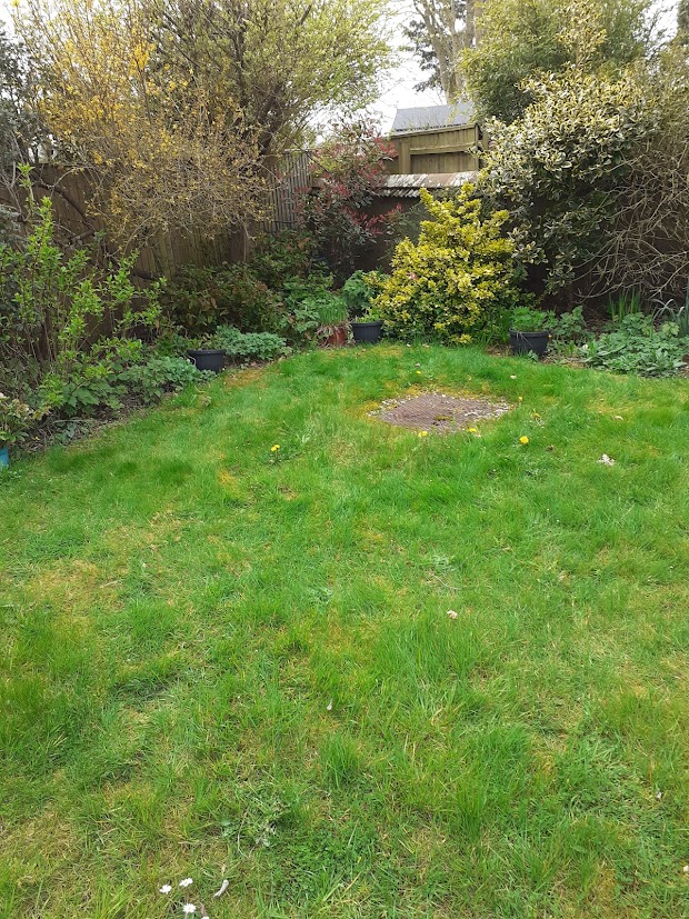 Before…. large shrubs on the Southern border blocked light, and took up too much space. The sightlines were blocked by shrubs our of scale, and the lawn was peppered with drainage hatches.