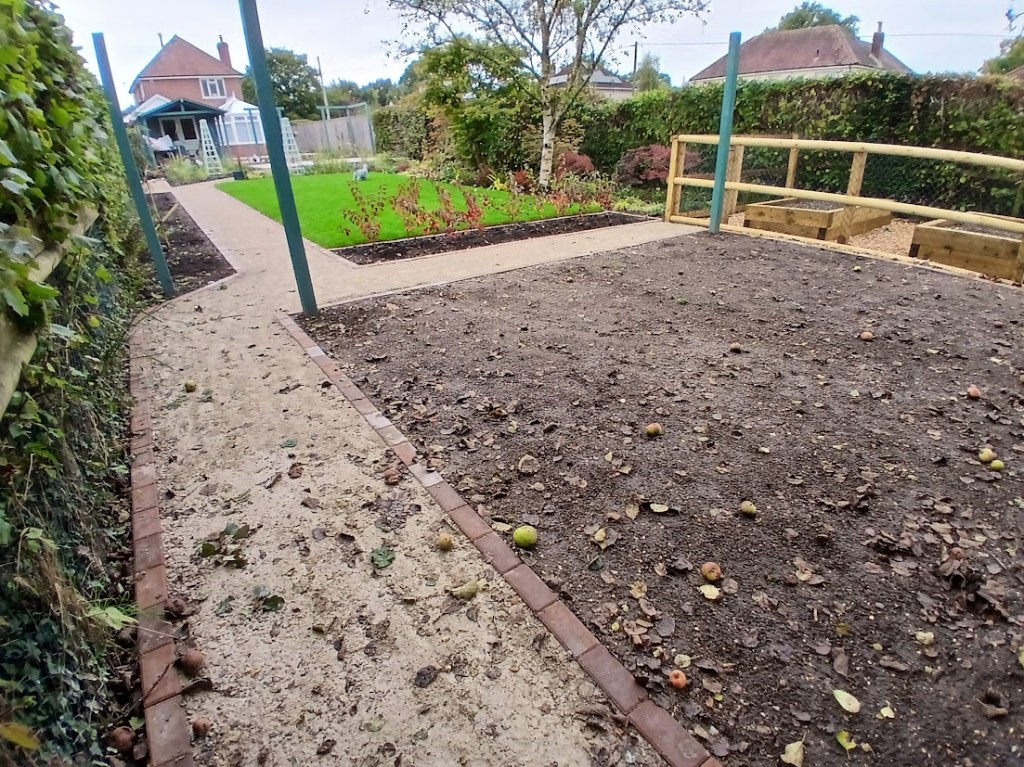 Our Clients’ beautiful rural location benefits from big skies, native hedging, and lots of wildlife. The Clients wanted to keep as many plants and as much material as possible, so we developed a scheme that gave dedicated spaces to wildlife, a child/pet safe pond, veggie growing plot, and more formal areas for relaxation, entertainment, and play.