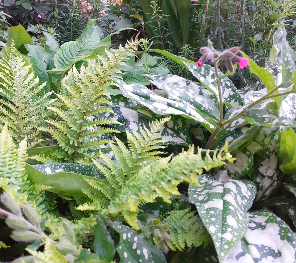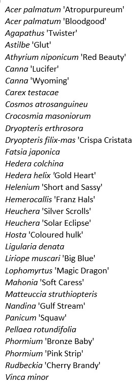 This garden has been designed to provide inspiration for a compact space, perhaps in a new build plot or in an urban setting. In these situations, neighbouring homes and boundaries can shade borders for much of the day; the borders here use plants which thrive in partial shade, and we’ve introduced species which prefer sun in the centre of the plot which gets the best light. Very few plants need special care and most are hardy requiring little over-winter protection. Dense planting will reduce weeding, which is ideal for a busy couple. Greens, plums, and pops of orange give a lush, opulent feel to the planting which has permanent form in all seasons; flowers are limited but provide changing points of interest through the year.