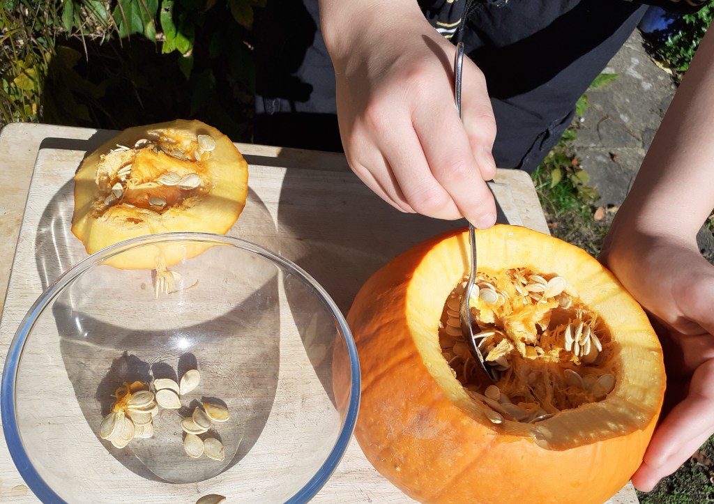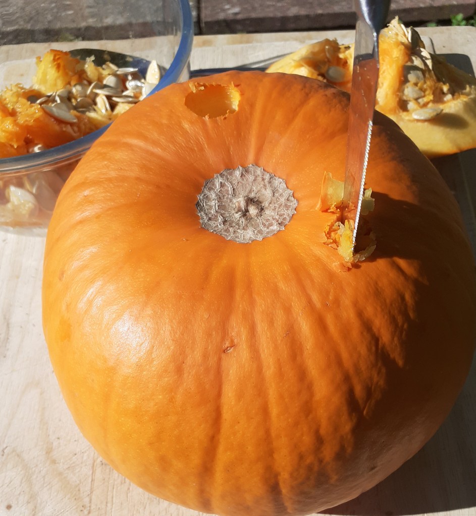 Remove the top of your pumpkin with a sharp knife, this should be done by an adult. Scoop out the seeds and keep to one side