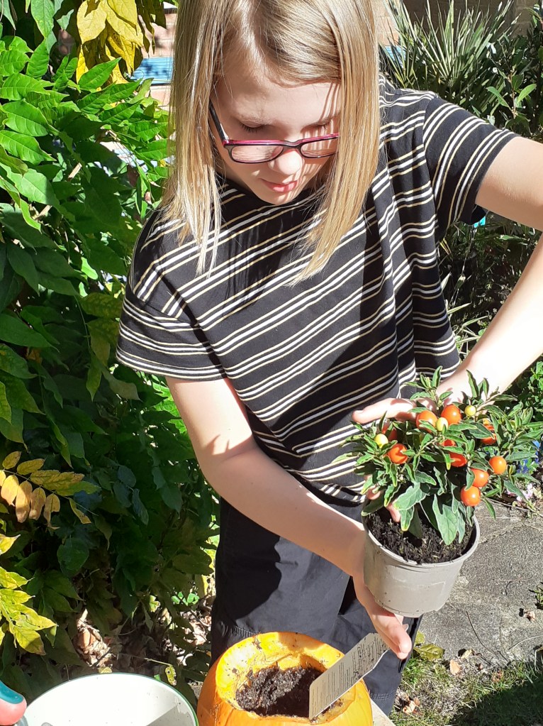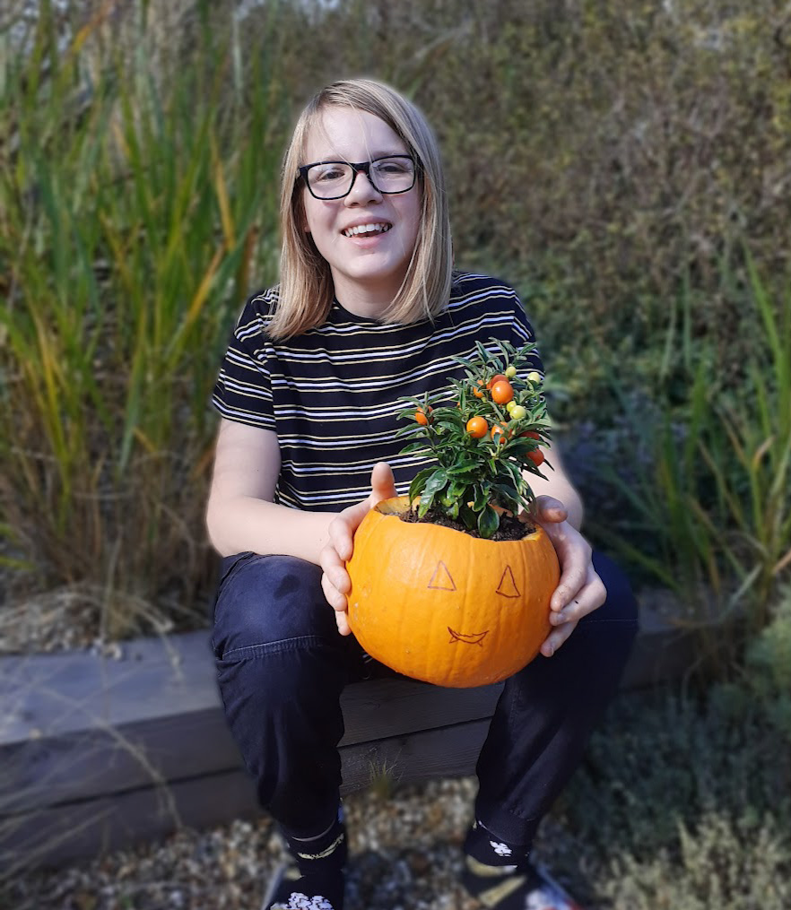 After Hallowe’en, your plant can be moved to a permanent home in the garden, and the pumpkin composted, or put into your food waste bin (after being emptied of course!)