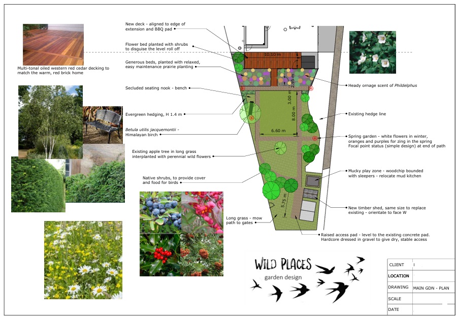 Keen to introduce children to the wildlife, the meadow (still coming up!) and native shrubs at the end of the garden adjoin a safe play area. This is designed to comply with regs, and is dressed in play bark. The new climbing frame is on order – Wild Places can’t wait to visit soon