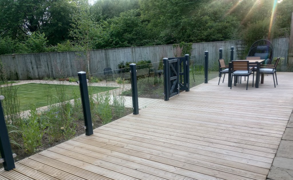 Fence treatment helps the existing boundary recede – glass balustrade and bespoke gates keep children and dogs safe